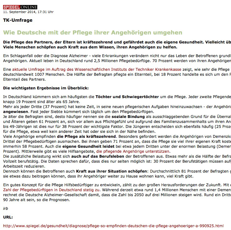 Demenz und Alzheimer gehen meistens „automatisch“ über in das Thema „Pflege“ über, anbei ein Artikel, zu einer entsprechenden (PR) Auswertung der Techniker Krankenkasse.